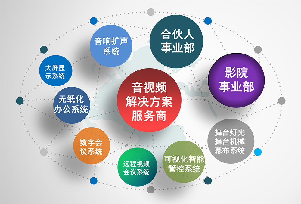 企業(yè)以音視頻解決方案服務(wù)和英嘉尼影院品牌為戰(zhàn)略方向,努力為全國(guó)128個(gè)城市提供專業(yè)化音視頻產(chǎn)品。