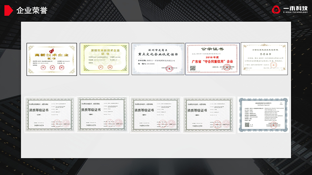 深圳市一禾音視頻科技有限公司創(chuàng)立于2001年,為國(guó)家高新技術(shù)企業(yè),深圳市高新技術(shù)企業(yè),重點(diǎn)文化企業(yè),廣東省守合同重信用企業(yè),通過了國(guó)家貫標(biāo)知識(shí)產(chǎn)權(quán)體系認(rèn)證、ISO9001質(zhì)量管理體系認(rèn)證、ISO14001環(huán)境管理體系認(rèn)證、OHSAS18001職業(yè)健康管理體系認(rèn)證。