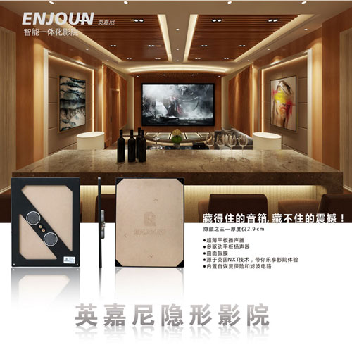 英嘉尼隱形影院主要采用自主研發設計生產的隱形音響V2,厚度僅2.9cm,可以完全嵌入墻體,無需聲場改造,完全隱形與現代設計媲美。