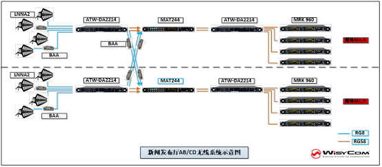 能夠實現這么多通道的無線話筒隨意分配使用,要歸功于WisyCom的天線矩陣MAT244。天線矩陣MAT244是整個系統的核心,互通互聯的房間通過天線矩陣系統統一管理,將所有天線分配器的信號分配到每個房間內的無線接收機內,實現話筒隨意切換使用。